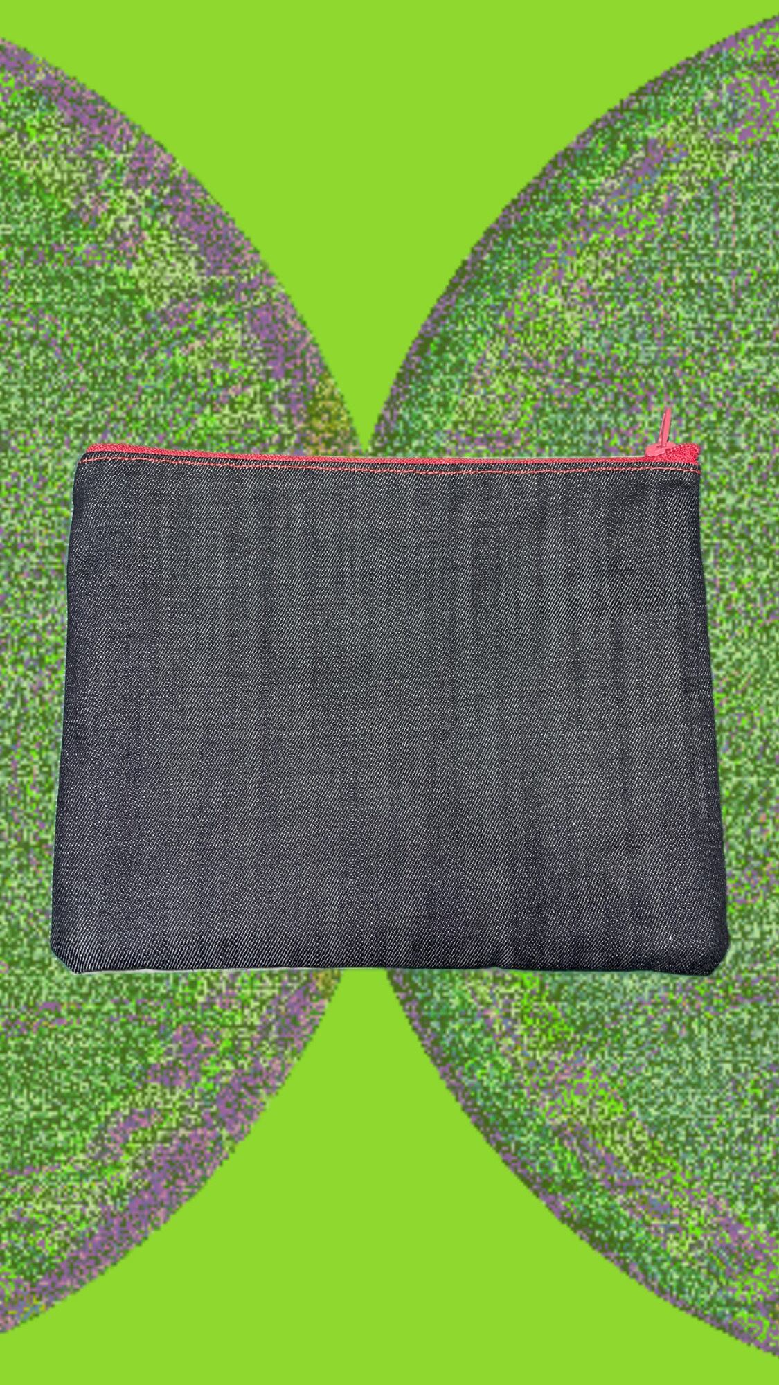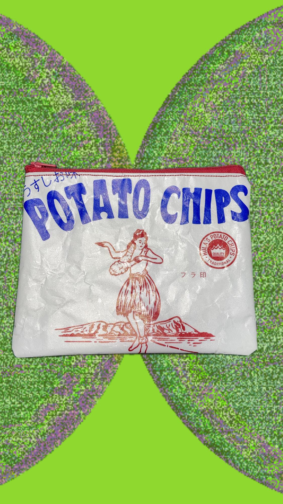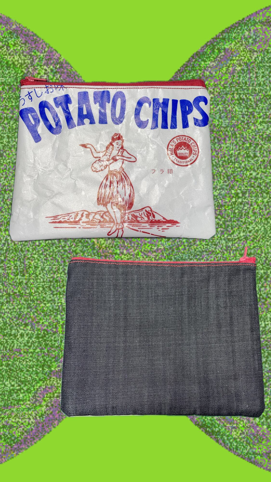 ポテトチップスのパッケージを加工してポーチにしました。表面は加工したパッケージ、裏面はデニム生地を使用して仕上げています。