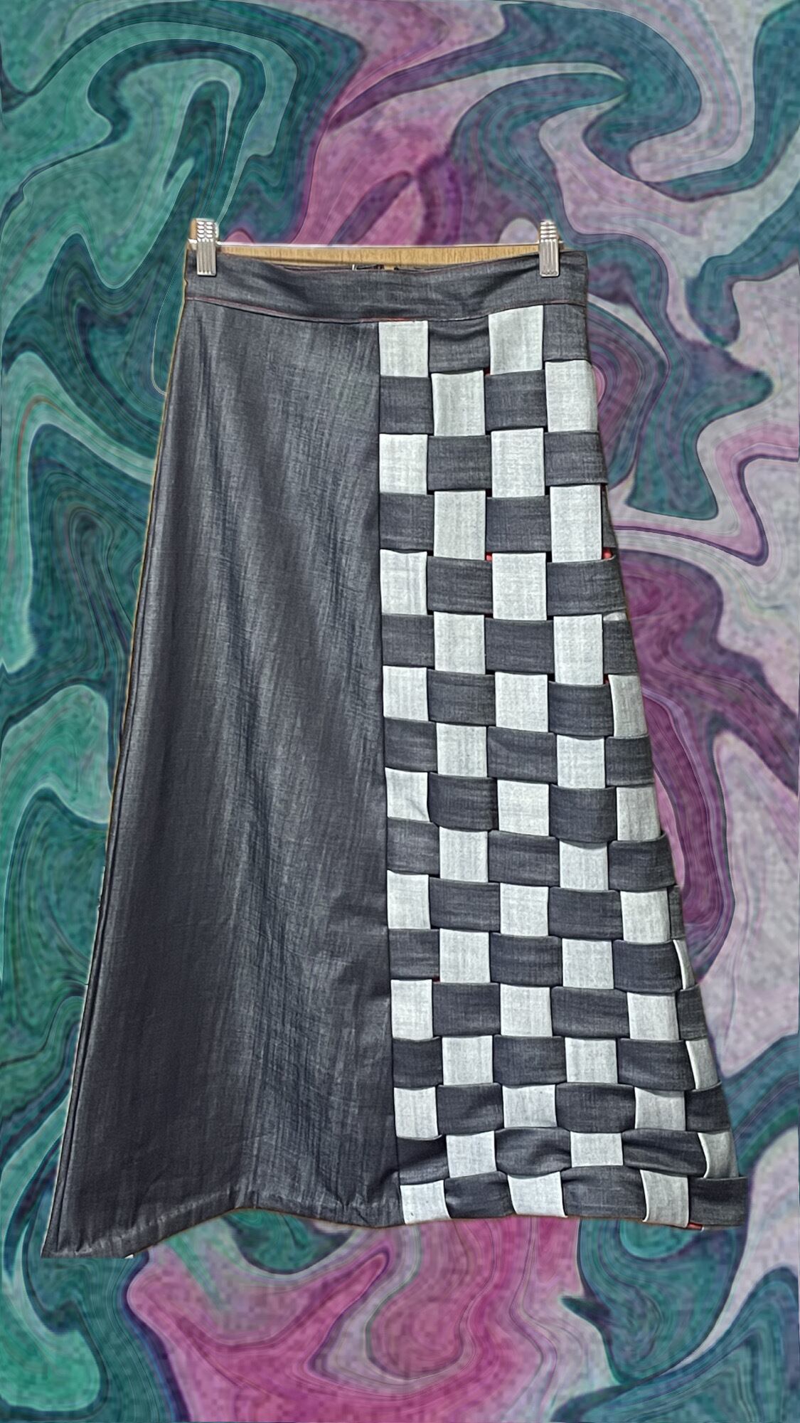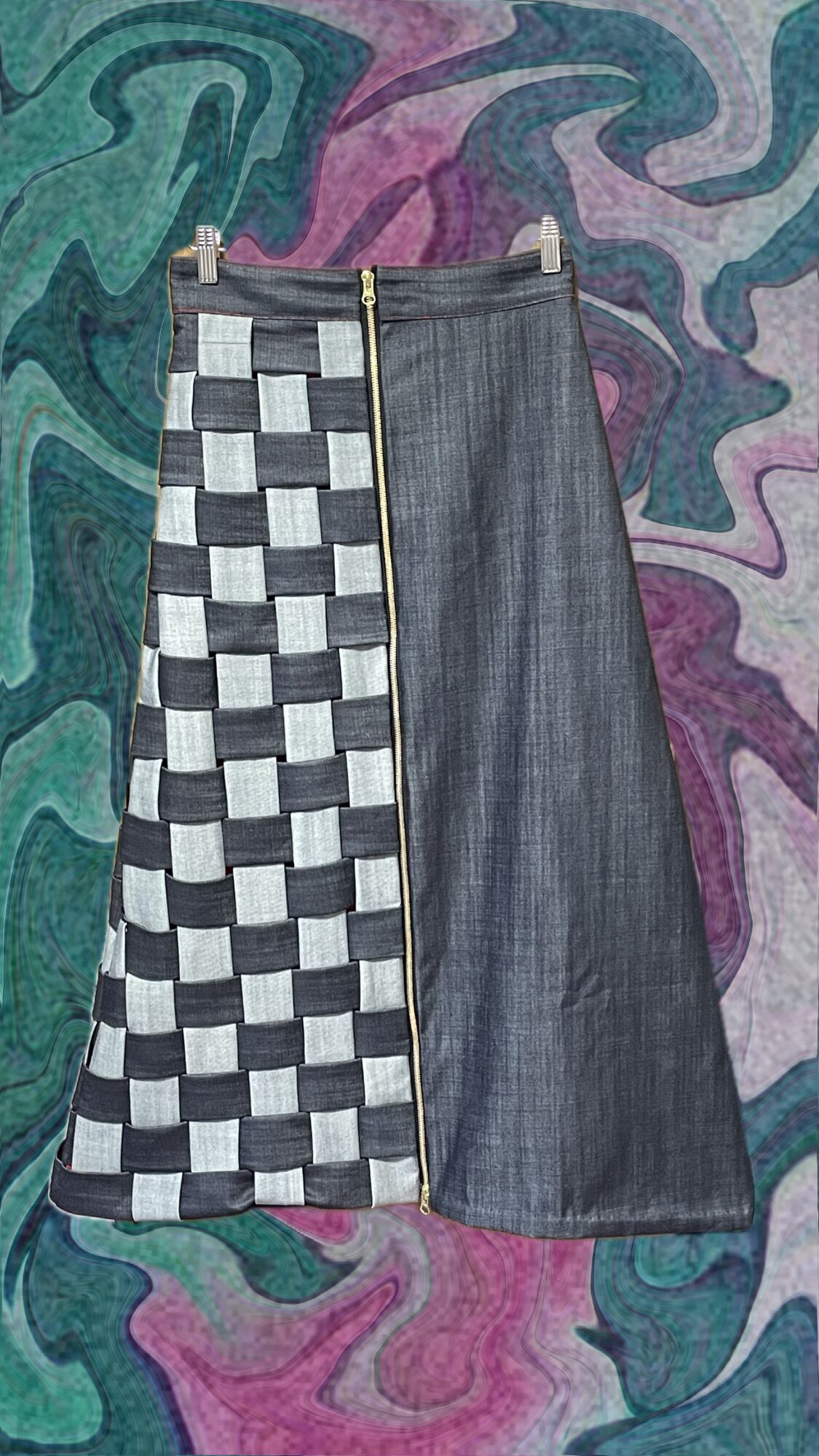 半身でデニム生地とデニムを織り込んで格子柄にしたアシンメトリーデザイン。
