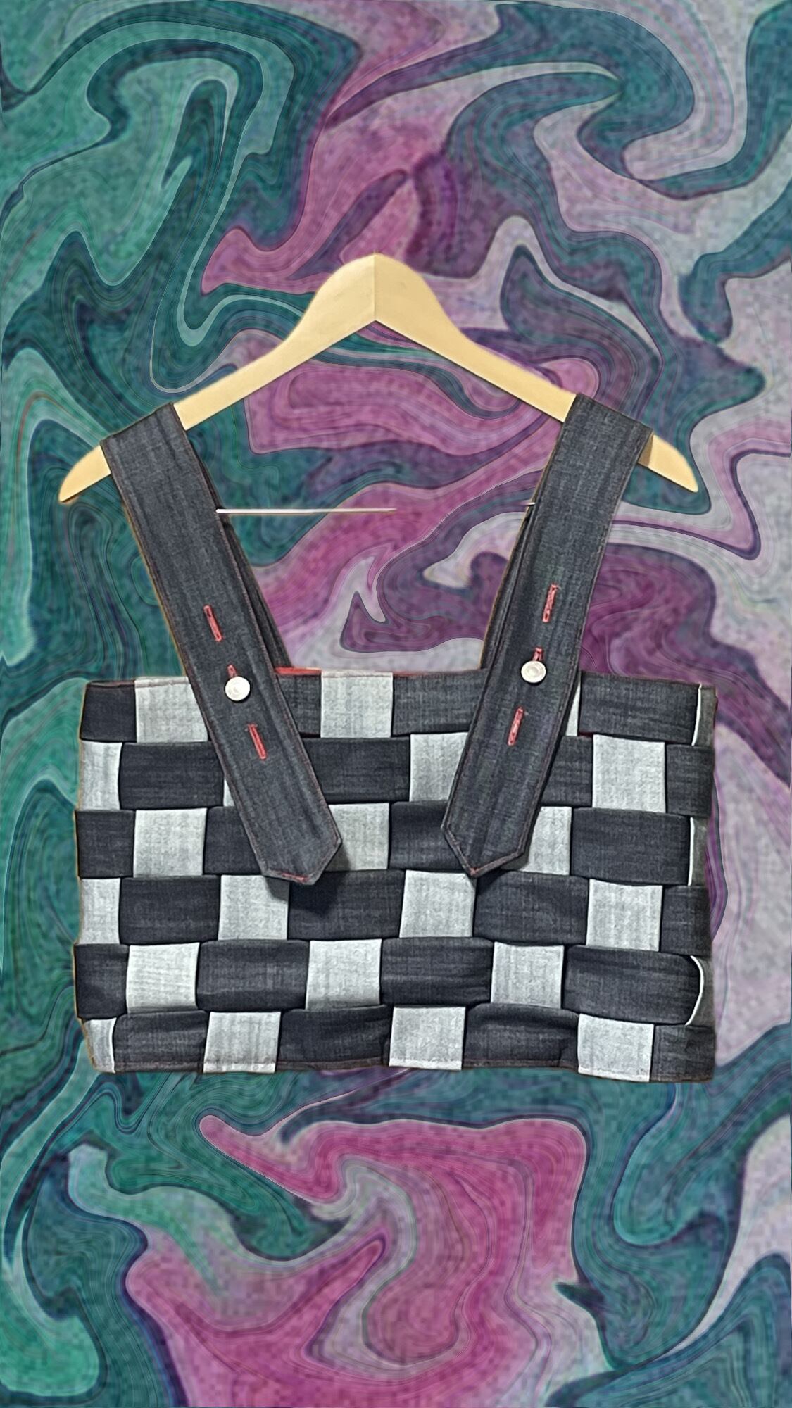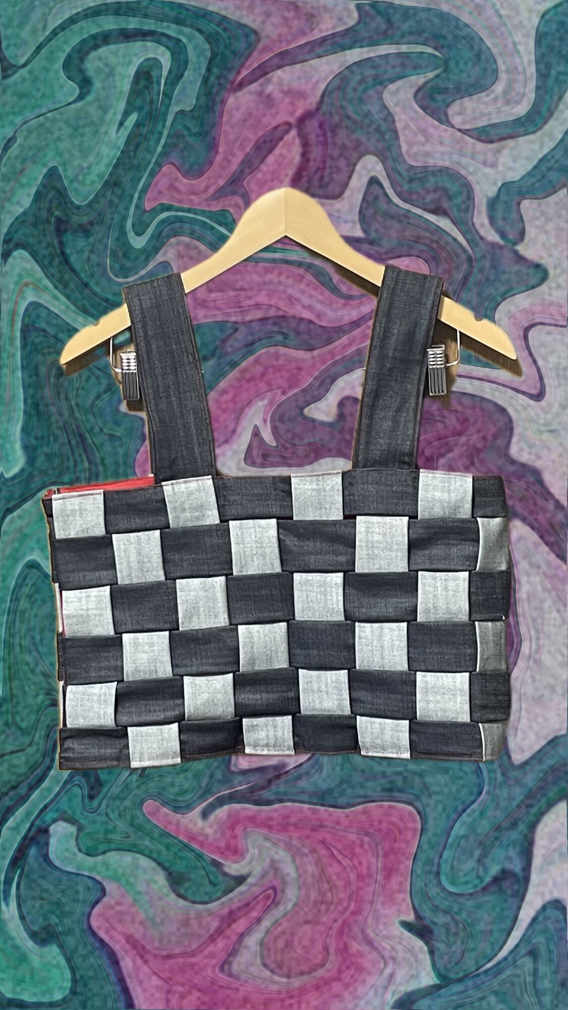 デニム生地を織り込んで格子柄にしたビスチェ。