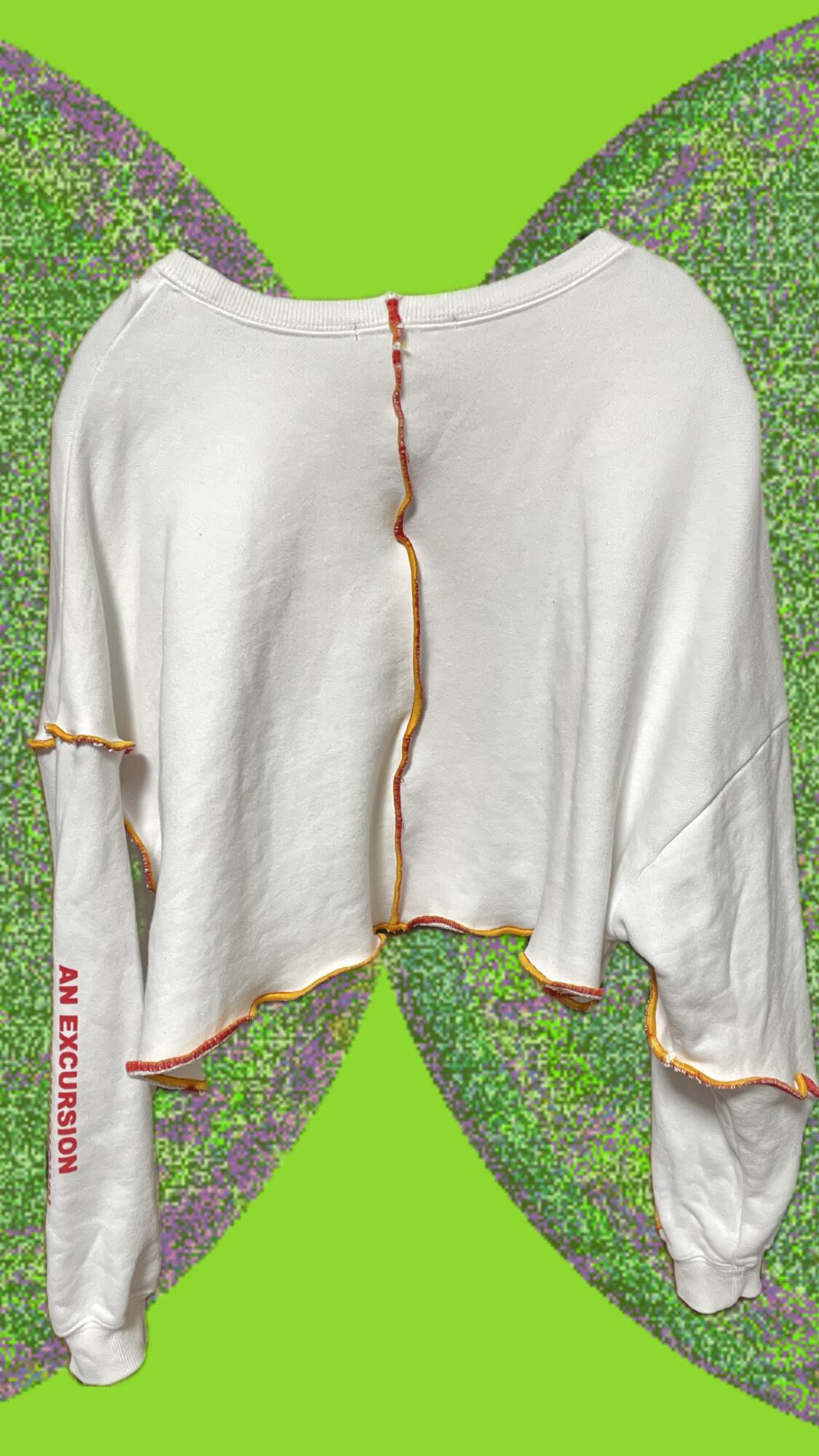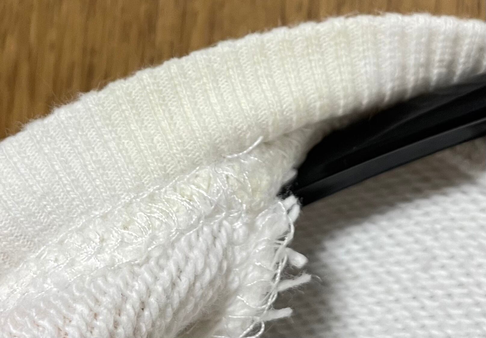 裾や袖部分などにメローを散りばめ、可愛らしい雰囲気に仕上げました。メロー部分も2色の糸を使うことで見る角度によって色が変わるようにしました。
